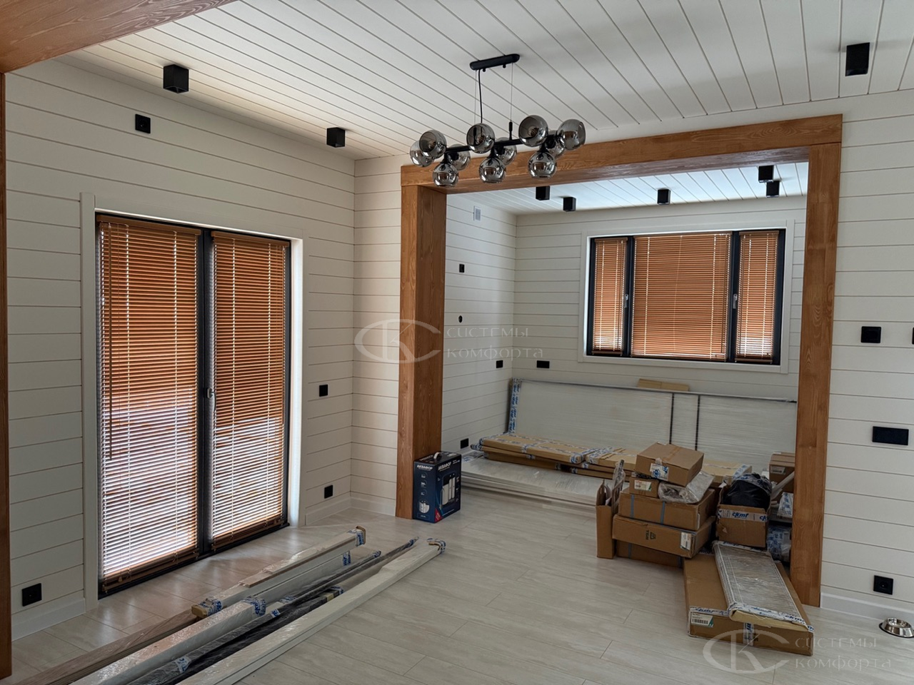 Деревянные варианты идеально сочетаются с огромными панорамными окнами и небольшими окошками на кухне.