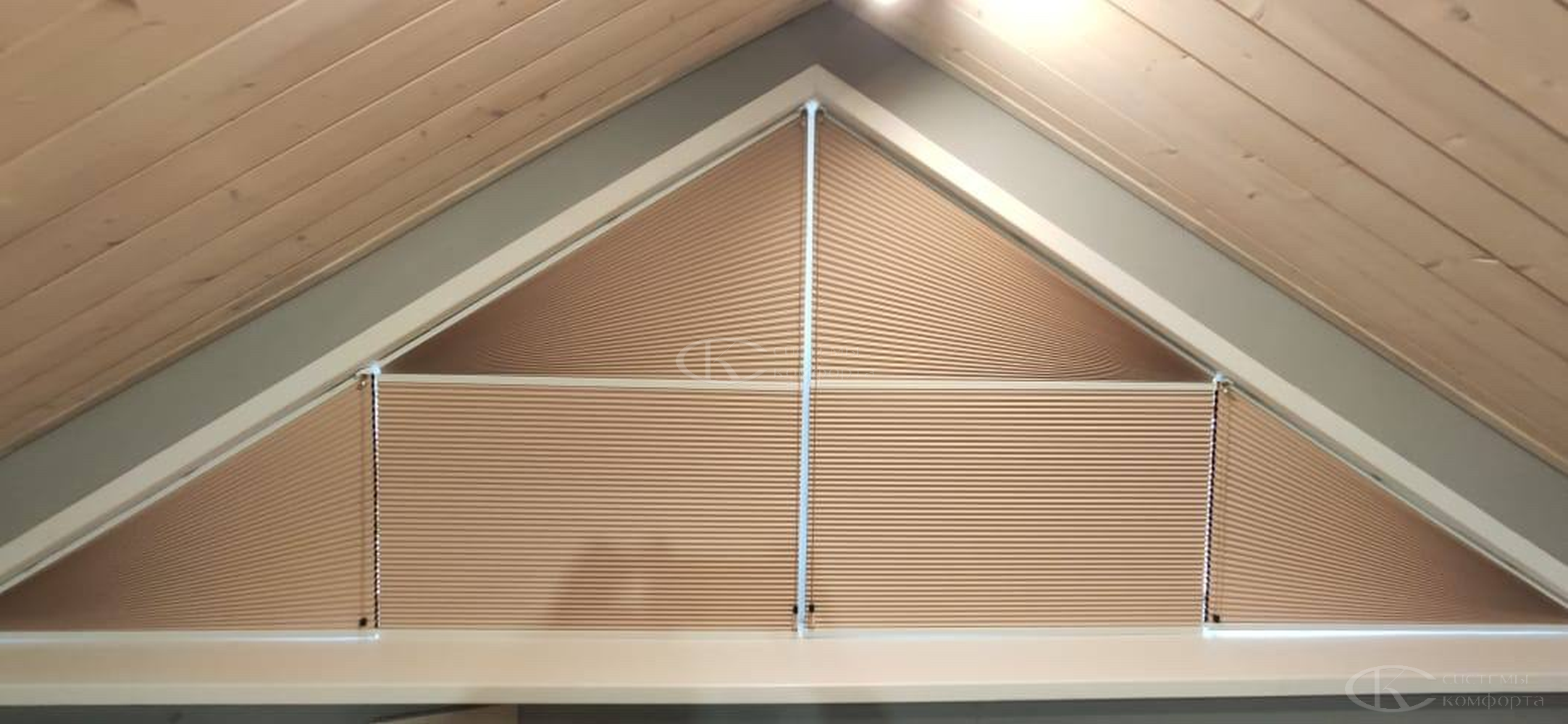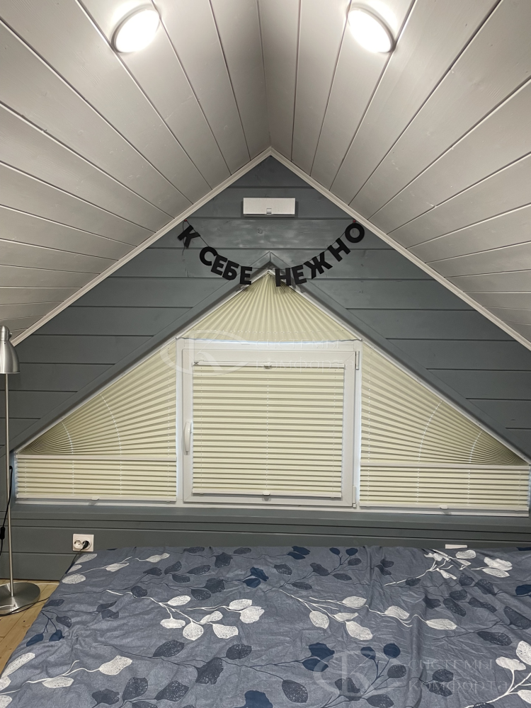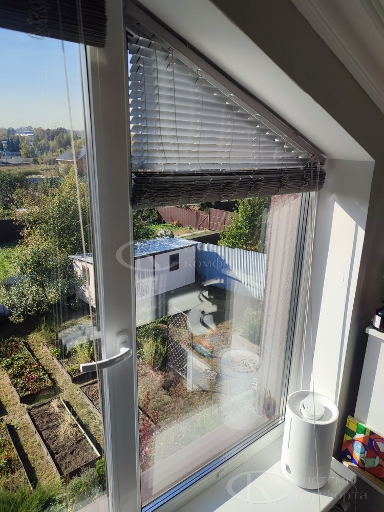Компания «Системы комфорта» изготавливает жалюзи на треугольные окна и на другие проемы нестандартной формы по индивидуальному заказу. Чаще всего они встречаются в мансарде: окно треугольной формы размещается на фронтоне и помогает обеспечить естественное освещение подкровельного пространства. Однако и в других помещениях могут быть оконные проемы необычной формы, для которых необходимо изготовить персональные системы управления светом.